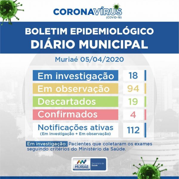 Um óbito está em investigação por suspeita de coronavírus em Muriaé. A Prefeitura, através da Secretaria Municipal de Saúde (SMS), está no aguardo do resultado do exame de um idoso de 65 anos. Ele era residente de uma cidade próxima e tinha diabetes, hipertensão e sequelas de Acidente Vascular Cerebral (AVC).
