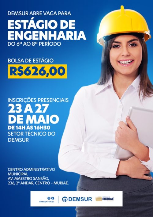 Estão abertas as inscrições para vaga de estágio em Engenharia Civil para estudantes do 6° ao 8° período do curso. A bolsa ofertada pelo Departamento Municipal de Saneamento Urbano de Muriaé (DEMSUR) é de R$626,00 para uma jornada de 20h semanais. As inscrições são gratuitas, presenciais e devem ser feitas de 14h às 16h30, diretamente no setor técnico do Demsur, localizado no 2° andar do Centro Administrativo Municipal.