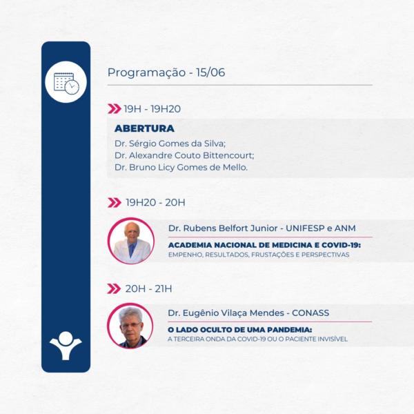 • 19h20 – Academia Nacional de Medicina e COVID-19: empenho, resultados, frustações e perspectivas – Dr. Rubens Belfort Junior (UNIFESP e ANM)