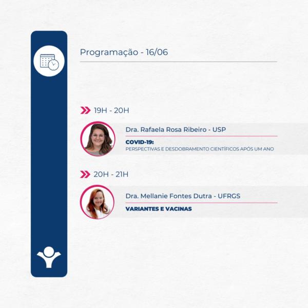 • 19h – COVID-19: perspectivas e desdobramento científicos após um ano – Dra. Rafaela Rosa Ribeiro (USP)