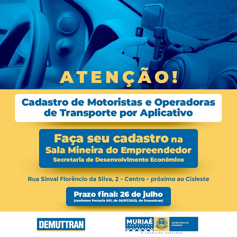 Os motoristas e as operadoras de transporte por aplicativo atuantes em Muriaé têm até o próximo dia 26 de julho para se cadastrarem junto ao município. A data-limite foi estipulada através da portaria número 01/2022, do Demuttran.