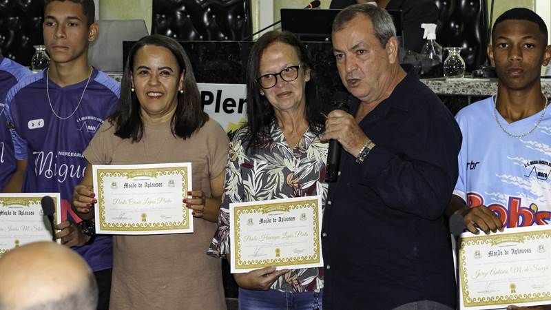 A sessão desta semana (24/05) marcou o retorno das entregas presenciais de Moções de Congratulações e Aplausos na Câmara de Muriaé neste ano de 2022. O vereador Ademar Camerino (MDB) homenageou os alunos da Escola Estadual Maria Augusta Silva Araújo, do bairro Santa Terezinha, além da diretora Suely, a vice Lenyr, o professor/treinador Lucas e o auxiliar técnico Sebastião, pelas conquistas dos primeiros lugares no JEM 2022 nas categorias futsal e xadrez.