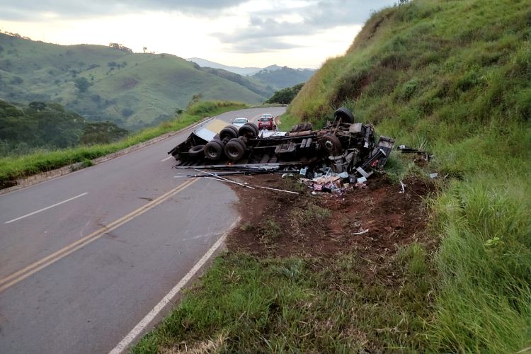 Um caminhão, carregado com materiais diversos, perdeu o freio e tombou na manhã desta quinta-feira (23), na BR-356, Serra do Pirapamema.