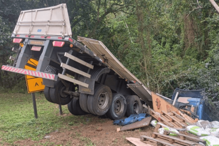Na manhã desta quarta-feira (24), uma carreta carregada com 29 toneladas de fertilizante tombou na BR-116, na altura da Serra da Boca d’Água, em Leopoldina. O acidente aconteceu em uma curva da rodovia, quando o motorista, de 46 anos, perdeu o controle do veículo.