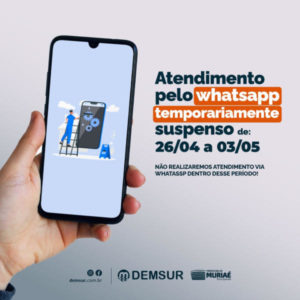O Departamento Municipal de Saneamento Urbano (Demsur) informa que durante toda esta semana o atendimento realizado pelo Whatsapp está suspenso em virtude do processo de mudança de instalação física onde...