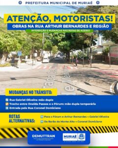 A Prefeitura de Muriaé informa que, devido às obras em andamento na região central da cidade, haverá mudanças temporárias no trânsito das ruas Efigênia de Freitas e Presidente Arthur Bernardes....