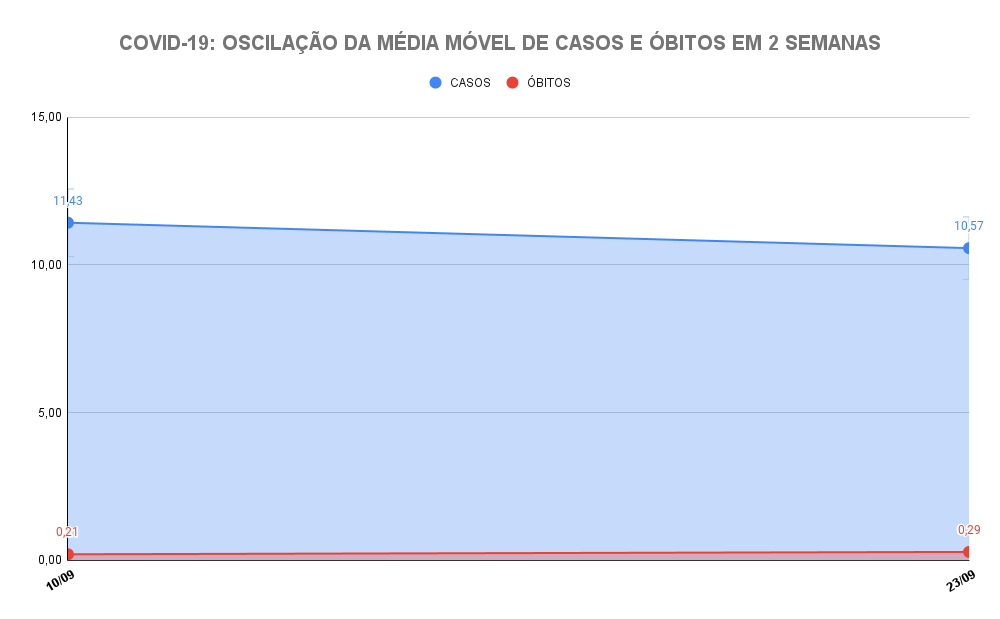 Média móvel – Ao se considerar apenas os números das últimas duas semanas, a média atual é de 10,57 casos diários. O número é 7,5% mais baixo que o de 14 dias atrás, o que significa que, durante esse período, o cenário da covid na cidade foi de oscilação para baixo, porém ainda dentro do patamar considerado como de estabilidade (que é de até 15%).