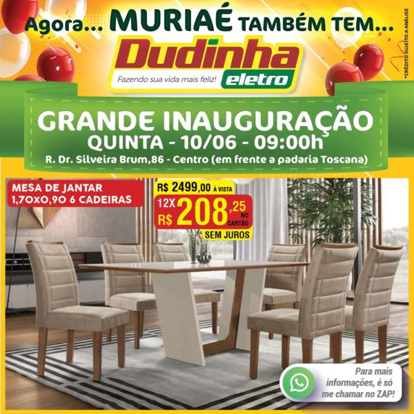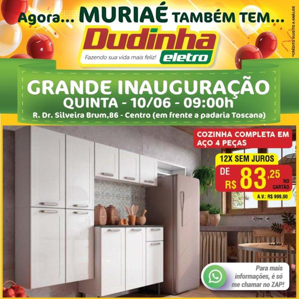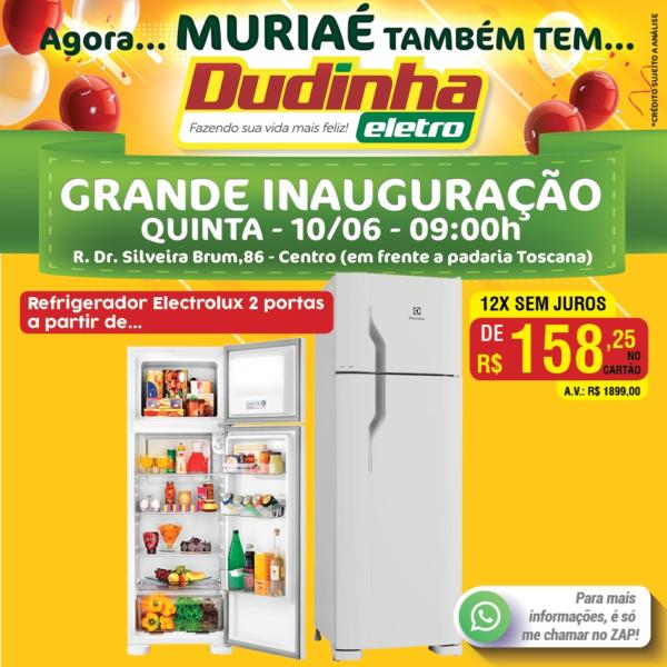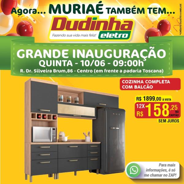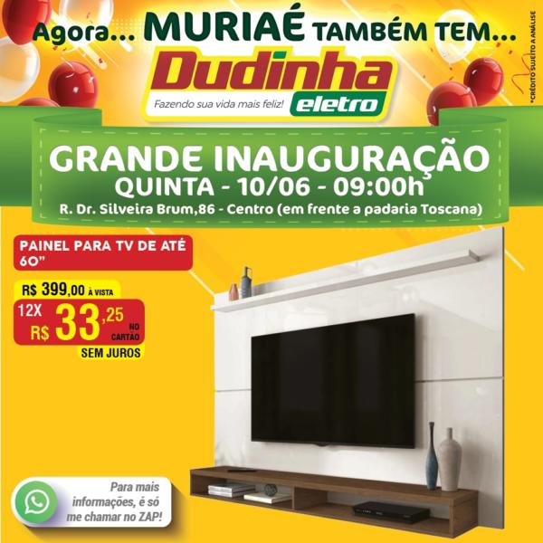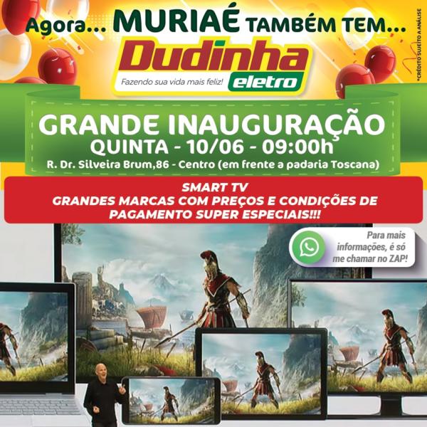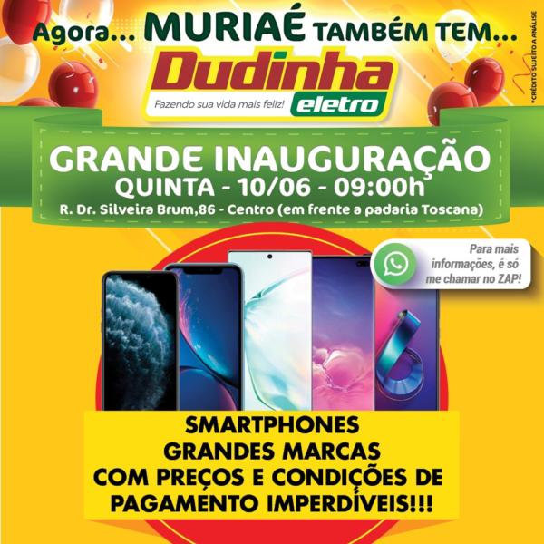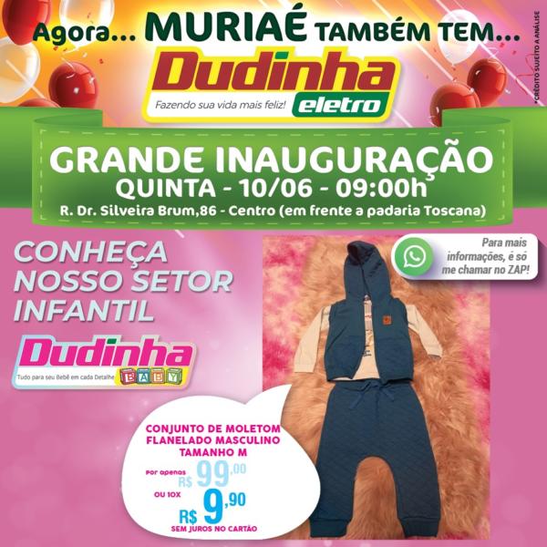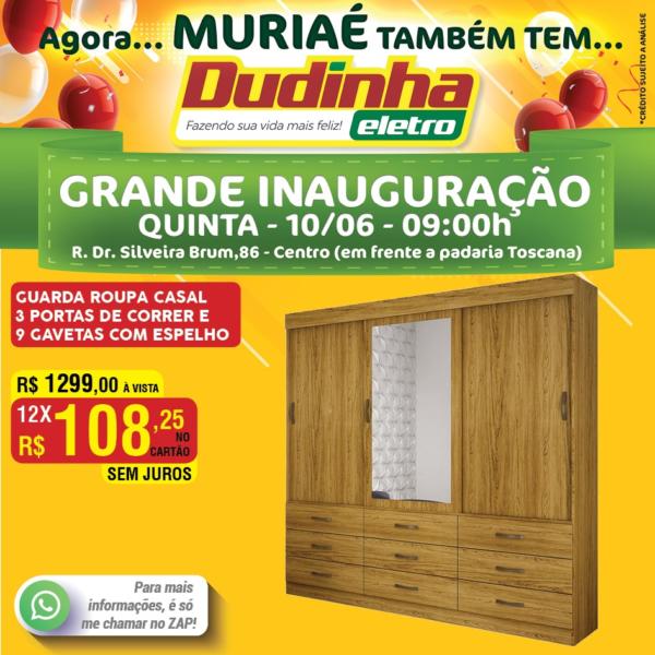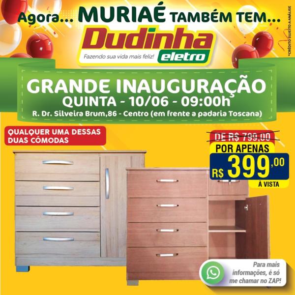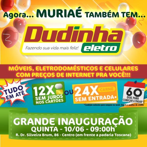 A Dudinha Eletro chega a Muriaé, em um espaço amplo, moderno e bem localizado. Na Rua Dr. Silveira Brum, nº86, Centro (em frente a Padaria Toscana). A grande inauguração acontece na manhã desta quinta-feira(10).