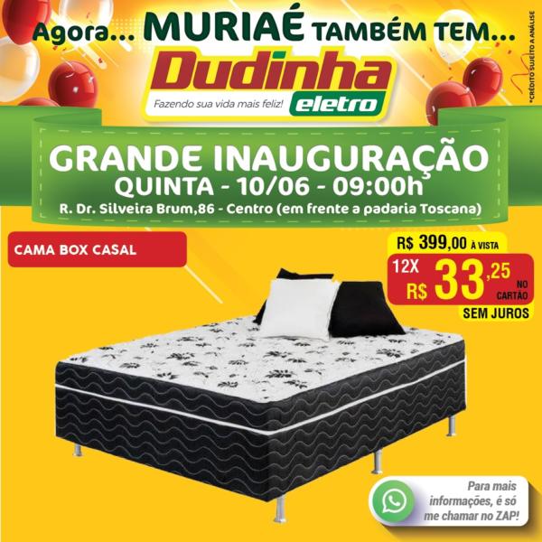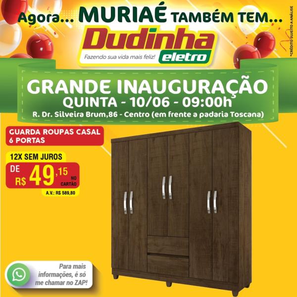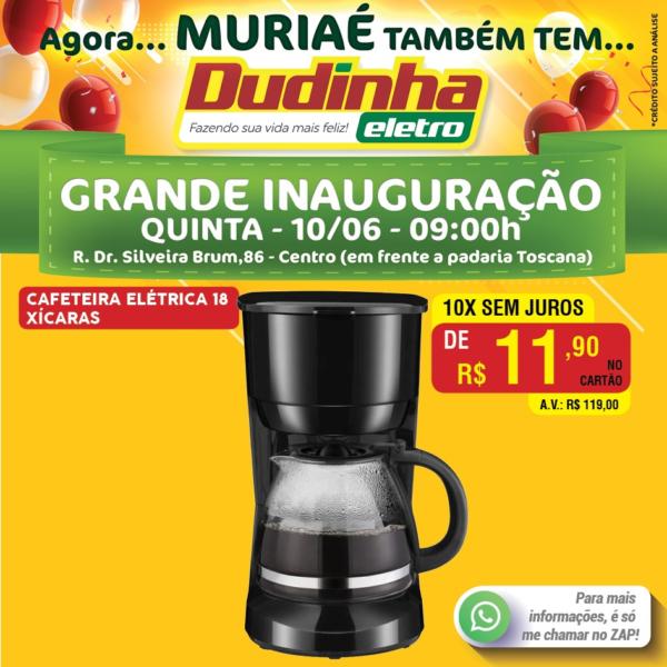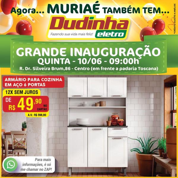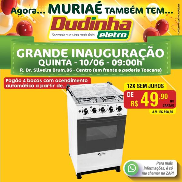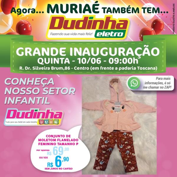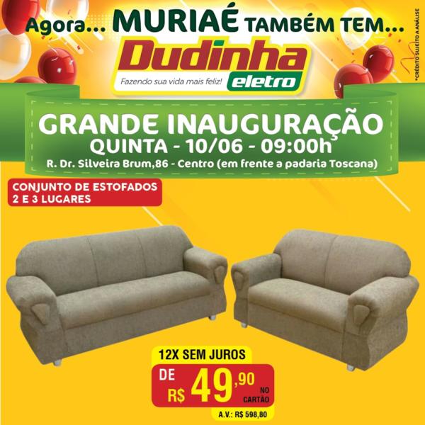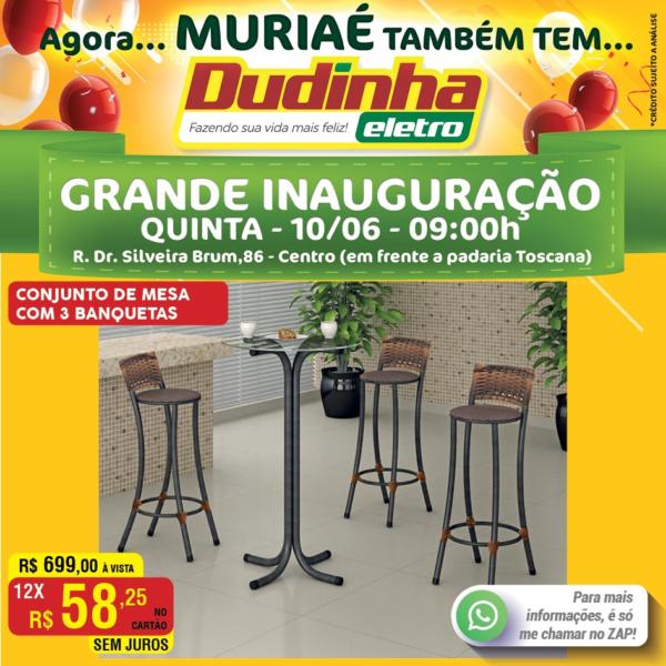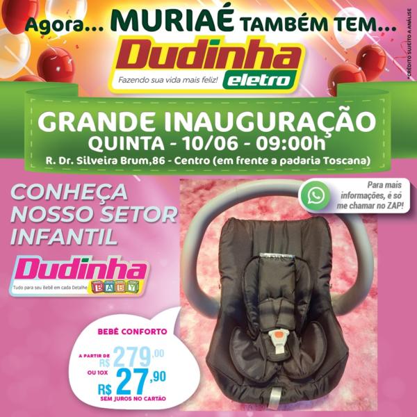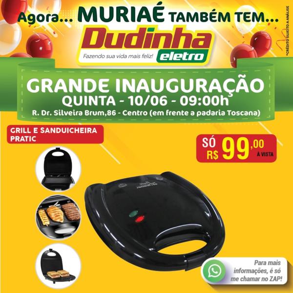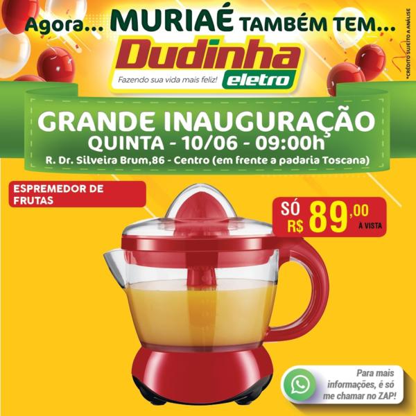 A Dudinha Eletro chega a Muriaé, em um espaço amplo, moderno e bem localizado. Na Rua Dr. Silveira Brum, nº86, Centro (em frente a Padaria Toscana). A grande inauguração acontece na manhã desta quinta-feira(10).