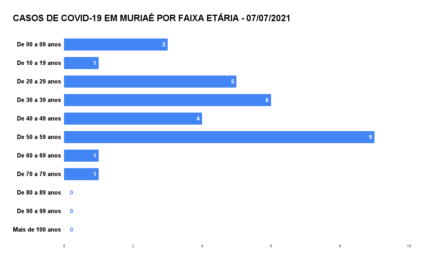 De 00 a 09 anos: 3 casosDe 10 a 19 anos: 1 casoDe 20 a 29 anos: 5 casosDe 30 a 39 anos: 6 casosDe 40 a 49 anos: 4 casosDe 50 a 59 anos: 9 casosDe 60 a 69 anos: 1 casoDe 70 a 79 anos: 1 casoDe 80 a 89 anos: Nenhum casoDe 90 a 99 anos: Nenhum casoA partir de 100 anos: Nenhum caso