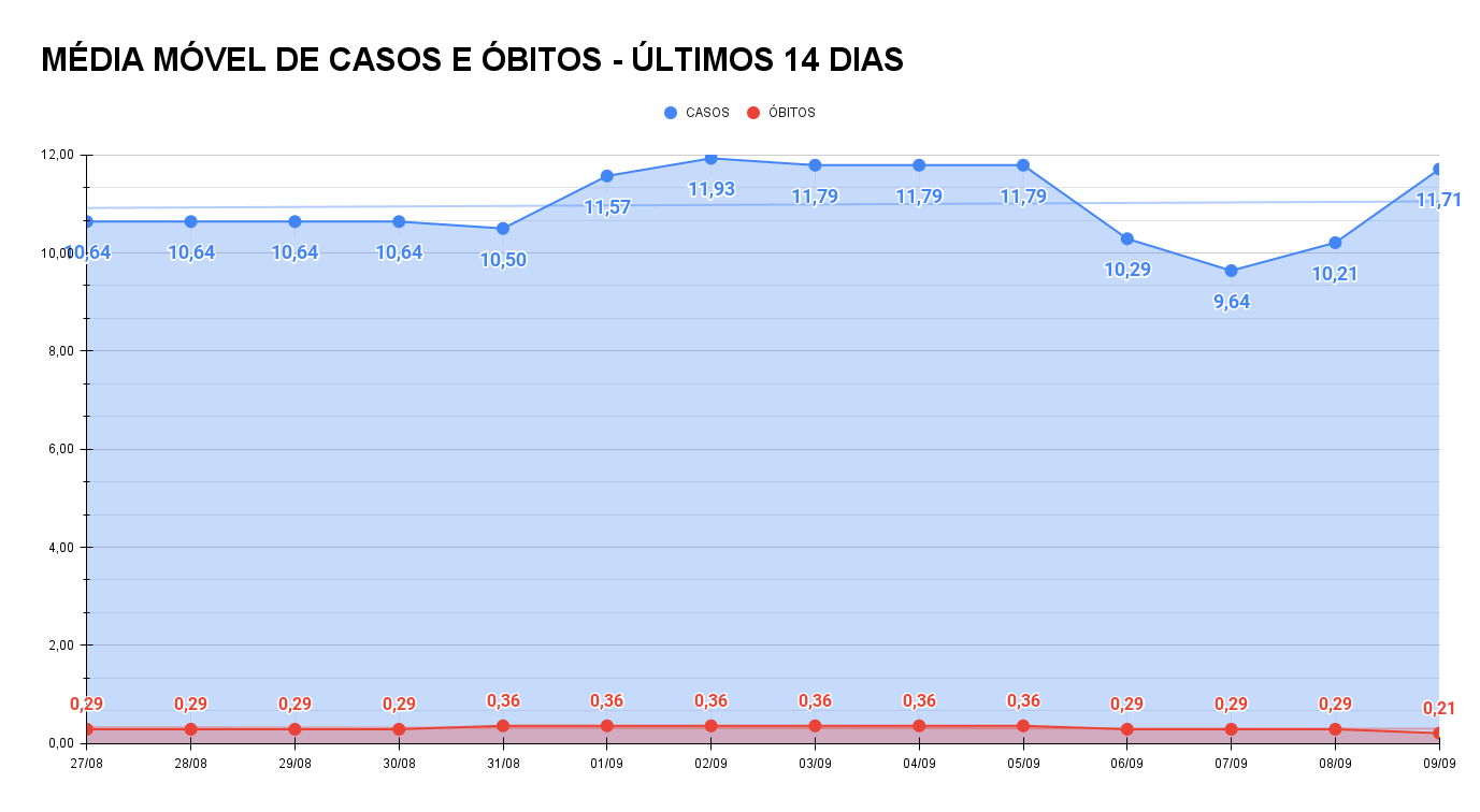 Já a média móvel, apenas com dados das últimas duas semanas, fechou em 11,71 casos diários. O índice é 10% superior ao de 14 dias atrás, o que ainda indica situação de estabilidade na evolução da doença – ainda que com altos e baixos na curva, conforme se vê no gráfico.