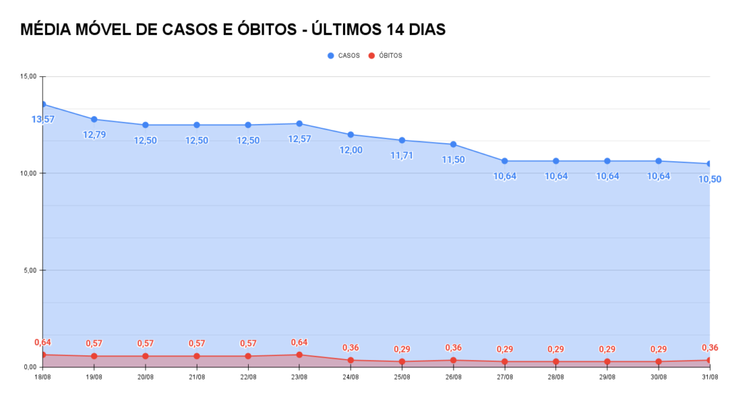 Mesmo com os novos casos, a média móvel teve ligeira redução. Na comparação com a de 14 dias atrás, verifica-se que a linha ainda está em queda, mas começa a se estabilizar em um patamar mais baixo.