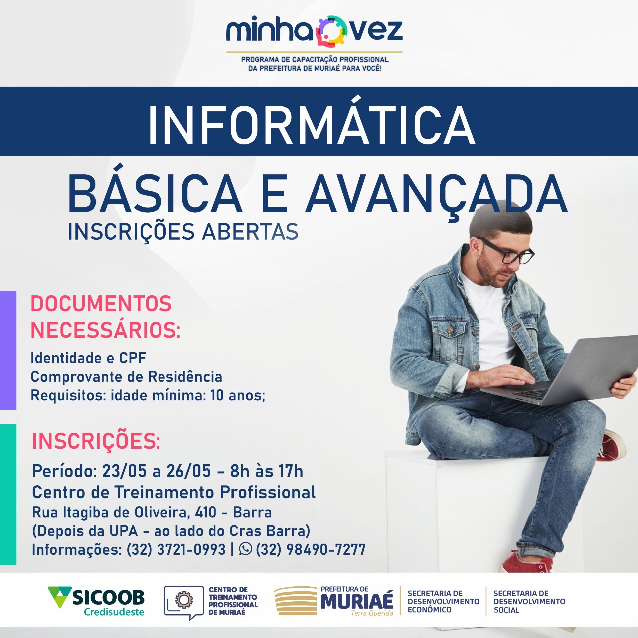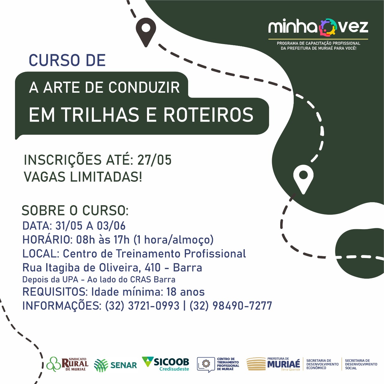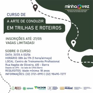 As oportunidades integram o programa Minha Vez, desenvolvido pela Prefeitura de Muriaé (através da parceria entre as secretarias de Desenvolvimento Econômico e Desenvolvimento Social) juntamente com o Senac, o Senar e ainda com o apoio do Sicoob Credisudeste.