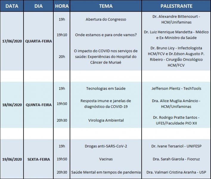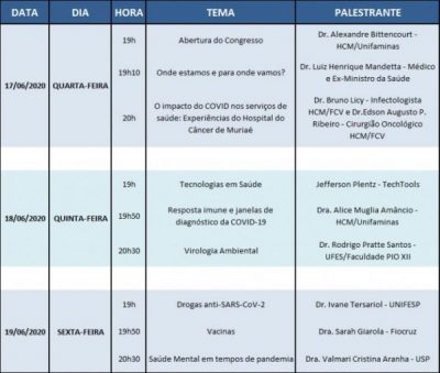 Com uma programação repleta de conteúdos relevantes, o Congresso contará com a participação do Médico e Ex-ministro da Saúde, Dr. Luiz Henrique Mandetta além de outras profissionais que abordarão temas relacionados ao enfrentamento do COVID-19 bem como as experiências e pesquisas da Fundação Cristiano Varella como forma de contribuição para a sociedade.