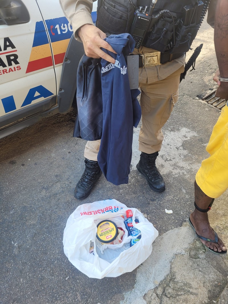 De acordo com o Boletim de Ocorrência os militares foram acionados pela gerente de um estabelecimento, relatando que através do circuito interno de filmagem, flagrou um indivíduo trajando bermuda amarela, chinelo de dedo, camiseta cinza, boné vermelho, de cor negra, estatura mediana, magro, subtraindo três camisetas e duas bermudas.