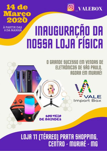 O grande sucesso em vendas de Eletrônicos em São Paulo, agora em Muriaé. A inauguração da Vale Import Box  será no dia 14 de março ás 8h da manhã, com sorteios de brindes durante o evento.