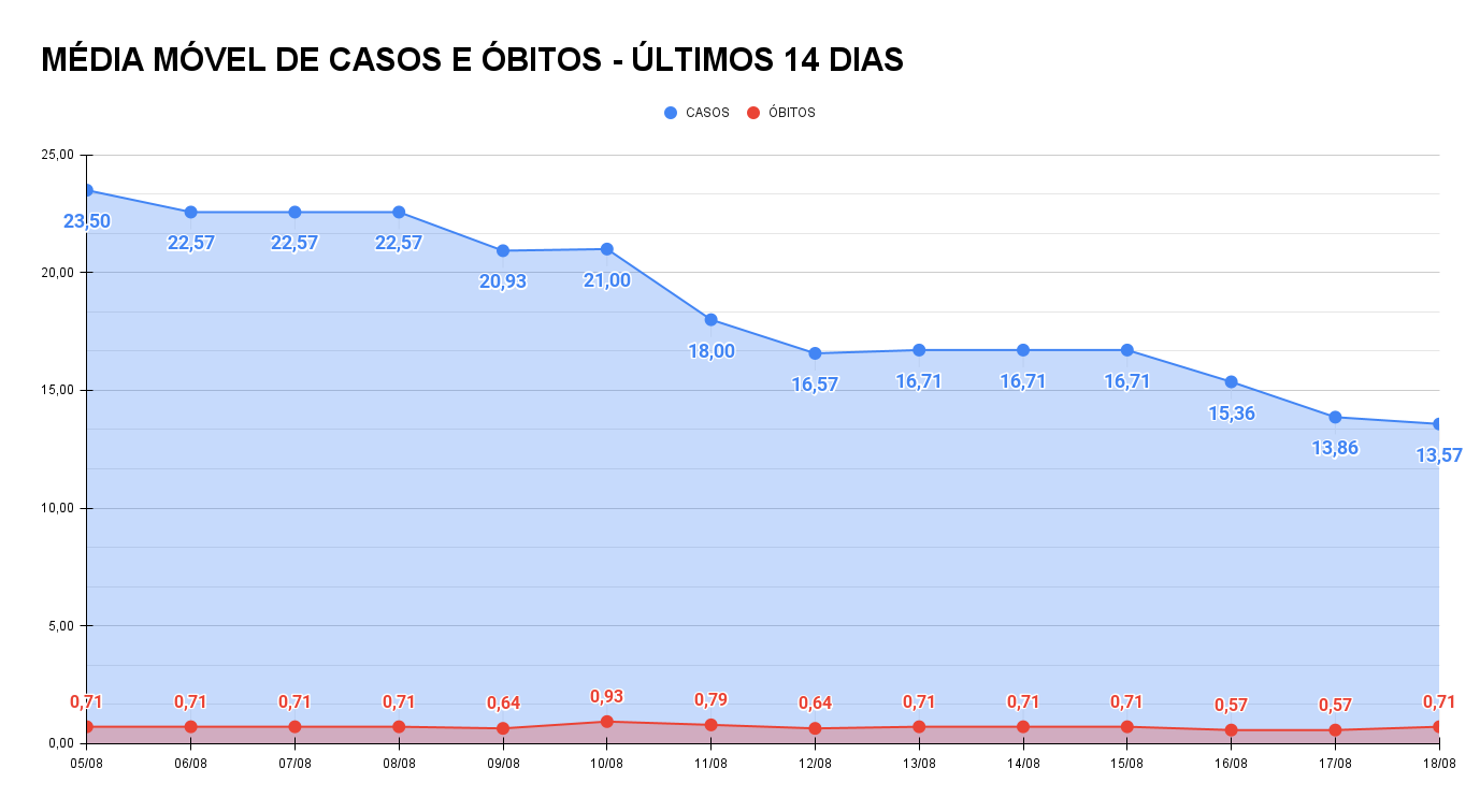 Também foram registrados 16 novas infecções pelo coronavírus. Já a média móvel está em 13,57 casos diários, considerando-se apenas dados das últimas duas semanas.