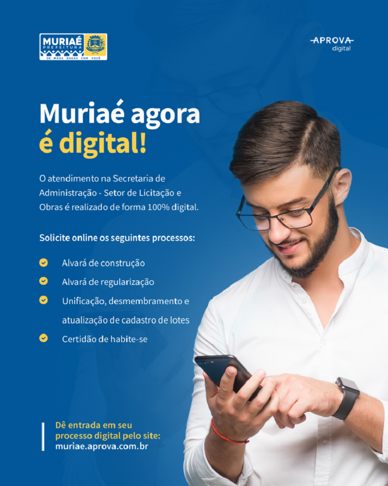 A plataforma Aprova Digital estará em funcionamento para o município de Muriaé a partir de segunda-feira, dia 19 de setembro, no link https://muriae.aprova.com.br/home.
