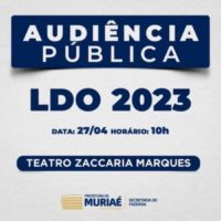 A Prefeitura de Muriaé realiza na quarta-feira, 27 de abril, a audiência pública de apresentação e discussão sobre a Lei de Diretrizes Orçamentárias (LDO) para 2023.