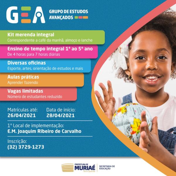 O Grupo de Estudos Avançados (GEA) é um projeto de escola em tempo integral criado pela Secretaria Municipal de Educação com o objetivo de proporcionar aos alunos do município um aprofundamento de aprendizagem, com aulas e atividades multidisciplinares.