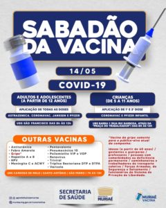 Muriaé terá mais uma edição do “Sabadão da Vacina”. O mutirão promovido pela Prefeitura, através da Secretaria Municipal de Saúde, acontece no próximo sábado, dia 14, com aplicação de imunizantes contra covid-19, gripe influenza e também das vacinas de rotina.