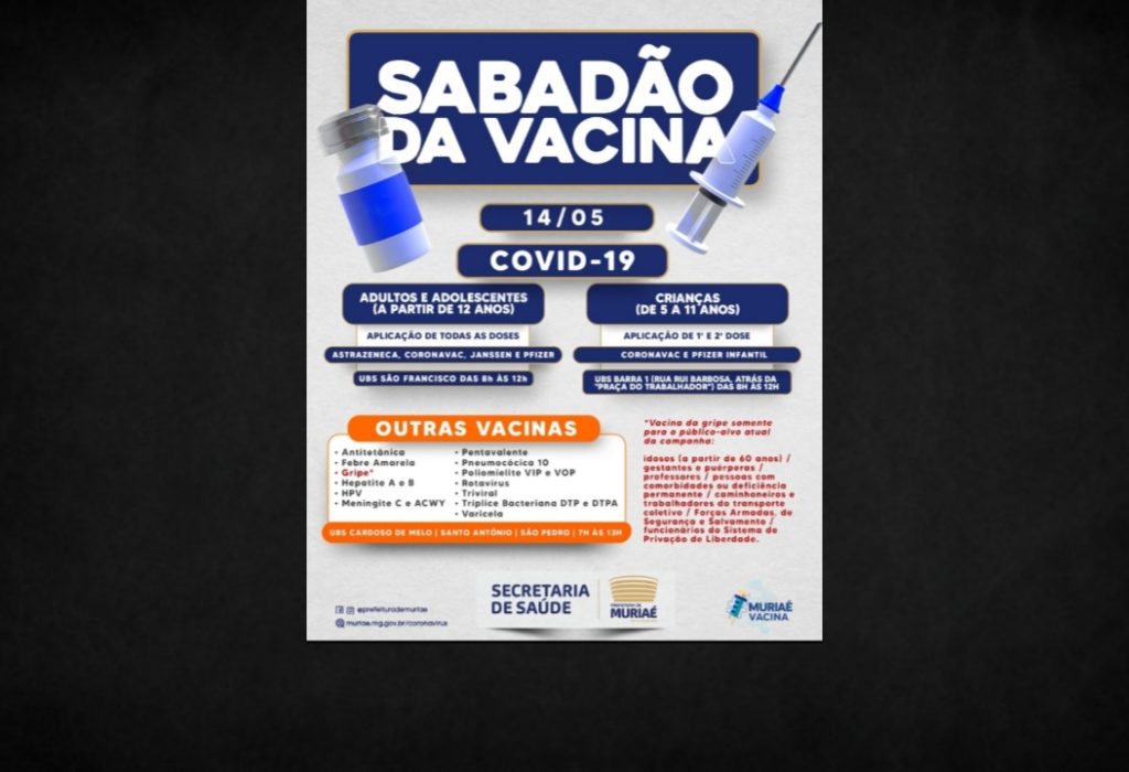 Muriaé terá mais uma edição do “Sabadão da Vacina”. O mutirão promovido pela Prefeitura, através da Secretaria Municipal de Saúde, acontece no próximo sábado, dia 14, com aplicação de imunizantes contra covid-19, gripe influenza e também das vacinas de rotina.