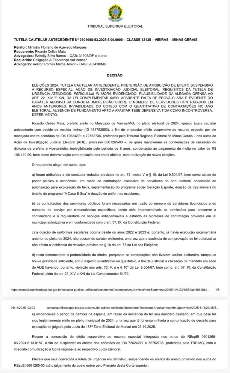O Tribunal Superior Eleitoral (TSE) concedeu medida cautelar em favor do prefeito de Vieiras (MG), Ricardo Celles Maia, e do vice-prefeito, Antônio Augusto Gouvêa Passos, suspendendo temporariamente os efeitos de decisão anterior que havia determinado o afastamento dos gestores municipais.