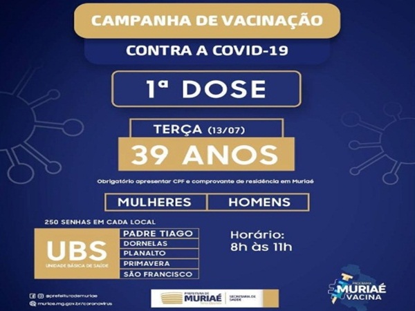 Chegou a vez das pessoas de 39 anos se vacinarem contra a covid-19 em Muriaé. A vacinação para esta idade será nesta terça-feira, dia 13 de julho, nas unidades básicas de saúde dos bairros Dornelas, Padre Tiago, Planalto, Primavera e São Francisco.